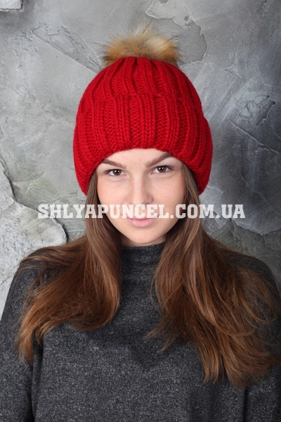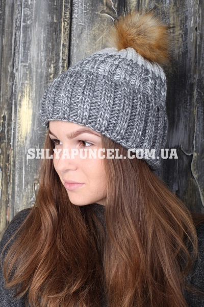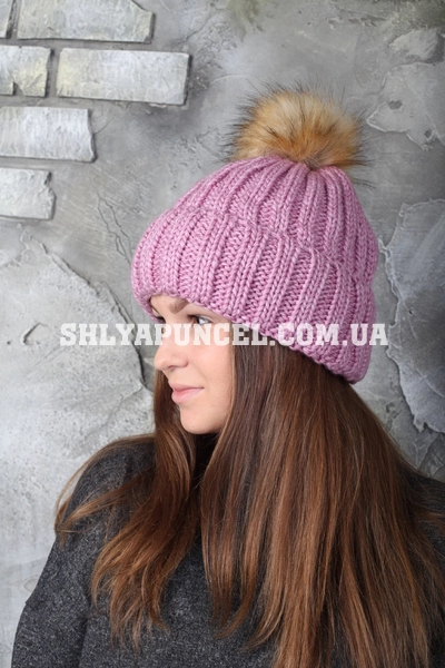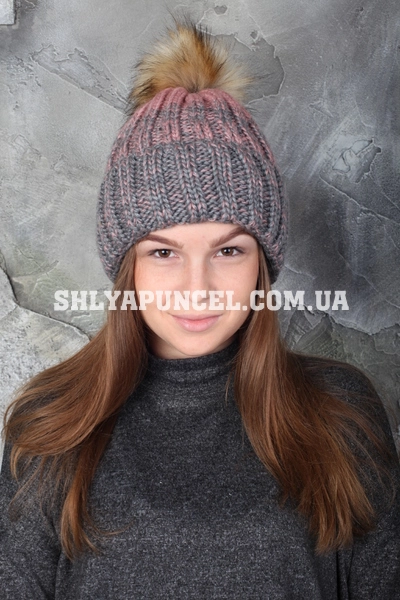 Теплая объемная молодежная шапочка с отворотом на флисе размер54-58, цвета: черный, красный, серый, серый меланж, беж меланж, пудра с серым, сирень.Бумбон из искуствуенного меха.